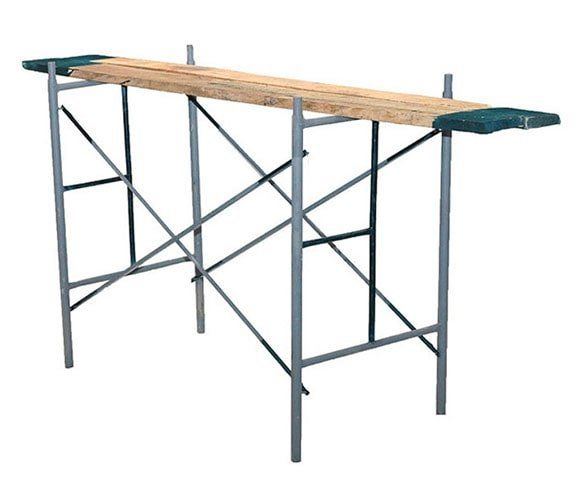 Andamio de fabricación tradicional a mano usando elementos como madera metal incluso bloques para hacer una estructura elevada ya se apara apoyar objetos o para trabajar sobre el.